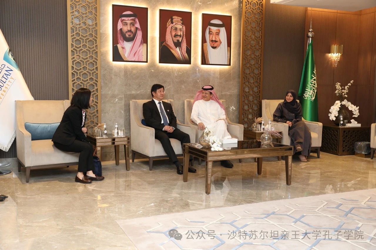 At 9 am, the delegation arrived at Prince Sultan University, where they were warmly welcomed by Dr. Ahmed Yamani, the President of Prince Sultan University. Then, they had a meeting with Dr. Mohammad Aljebreen, the Vice President for Academic Affairs at Prince Sultan University, Dr. Heba Khoshaim, Vice President of the Campus for Women, Ms. Tasneem Alsaati, Director of International Affairs, the Chinese and foreign deans of the Confucius Institute at Prince Sultan University (the "Confucius Institute" for short), as well as the deans of various schools and departments.