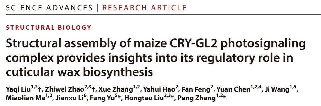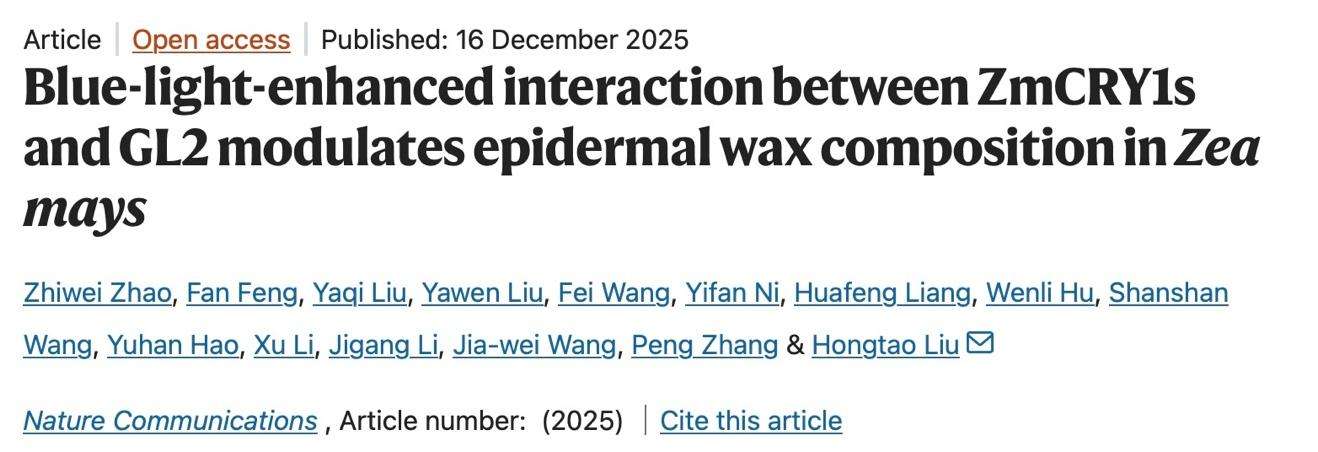 This achievement not only elucidates a new mechanism for plant stress resistance but also embodies multiple innovative breakthroughs, providing a crucial target for cultivating more sun-resistant and high-light-efficiency maize varieties. Professor Liu Hongtao's team also collaborated with Researcher Zhang Peng from the CAS Center for Excellence in Molecular Plant Sciences, to resolve the structure of the ZmCRY1s-GLOSSY2 protein complex. This work was recently published inScience Advances, offering direct evidence for the molecular basis of light signal transduction.
